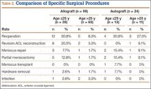 Revision rates were 10.1% (allograft group) and 4.2% (autograft group) (Table 1). This difference was not statistically significant (P = .18). In the allograft group, the revision rate was higher for patients younger than 25 years (20.5%) than for patients older than 25 years (3.3%) (Table 2). In comparison, in the autograft group, the revision rate was only 4% for patients younger than 25 years. For younger patients, the higher rate of revision with allograft (vs autograft) was statistically significant (P = .038). For older patients, allograft and autograft revision rates did not differ significantly (P = .19). No patient younger than 25 years required revision reconstruction after autograft ACL reconstruction.