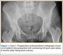 A 45-year-old woman fell from a horse about 8 months before presenting to the orthopedic outpatient clinic. Pelvic radiographs obtained after the fall were negative for fracture, but subsequent pelvic magnetic resonance imaging led to the diagnoses of minimally displaced left superior and inferior pubic ramus fractures and associated right-sided sacral ala fracture. The patient was treated with protected weight-bearing according to symptoms, but increasing activity-related pain and discomfort in the left groin persisted for months after injury. These symptoms were treated with analgesic medication, physical therapy, and chiropractic manipulation. Repeat imaging showed hypertrophic nonunions of the left superior and inferior pubic rami (Figure 1). Findings of the serologic testing performed for infection and metabolic deficiencies were normal at that time. The patient was referred for surgical consultation.