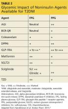 TZD (rosiglitazone, pioglitazone).7 This is the most effective class for addressing insulin resistance, the key physiologic defect in T2DM. TZD is the only class that has demonstrated long-term A1C reductions (> 5 y).9 The drugs in this class are not associated with hypoglycemia and have a low GI adverse-effect profile. The most common adverse effects are weight gain and fluid retention, which are even more commonly observed in patients also taking insulin. Additionally, there is concern about increased risk for atypical fractures in women, particularly postmenopausal women.