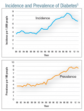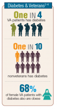 Diabetes mellitus (DM) is the seventh leading cause of death in the U.S., but after decades of rapid growth, both the incidence and prevalence appear to have leveled off. The VA spends $1.5 billion annually to treat patients with DM. Veterans are 2.5 times more likely than nonveterans to have diabetes, and many have comorbid conditions, including obesity, hypoglycemia, hypertension, dyslipidemia, cardiovascular disease, stroke, blindness, kidney disease, and amputations. Obesity and DM remain closely related, and more than two-thirds of women veterans with DM also have obesity.