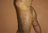 A man with a total cholesterol level of 1,045 mg/dL and a hemoglobin A1c of 12.6% presents with a new rash.