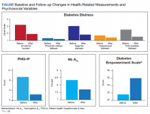 Twelve veterans (92.7%) completed the Follow-up questionnaires. The Figure illustrates statistically significant changes in patient-reported outcomes between baseline and follow-up. Clinically meaningful reductions were shown in total T2DM distress (t11 = 5.03, P < .01), T2DM emotional burden (t11 = 4.83, P =.01), and T2DM regimen-related distress (t11 = 5.14, P < .01). There was a significant increase in T2DM self-efficacy (t11 = 0.32, P = .008) as well. A statistically significant reduction was seen in depressive symptoms (t11 = 2.22, P = .048). While HbA1c fell by .56 percentage points (standard error of the mean [SEM], 31; P = .10), this change was not statistically significant. Follow-up analyses also showed a clinically, though not statistically, significant reduction in weight loss by 6.9 lb. (SEM, 3.8; P =.20), and reductions of generalized anxiety by 1.2 points (SEM, 1.4; P = .42). Pre- and postanalyses did not show differences among self-rated health, physician-related burden, interpersonal-related burden, and indicators of medication taking behavior.